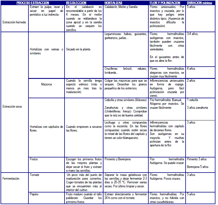 A continuación les dejo una tabla detallada de las hortalizas más comunes, con algunos pasos a seguir para obtener sus semillas.