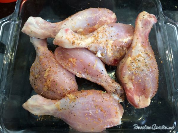 Aderezamos los muslos usando sazonador de pollo, un poco de la marinad y sal y pimienta. Reservamos en el refrigerador por 30 minutos para que la carne pueda absorber los sabores.