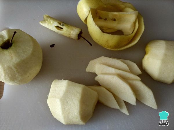 2. Derretir la mantequilla en la sartén. Pelar las manzanas y cortarlas en rodajas de media luna.