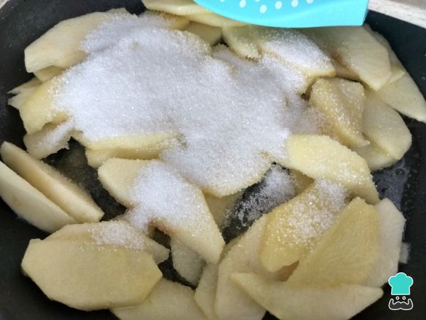 3. Saltear las manzanas en la sartén con la mantequilla por 4 minutos a fuego medio. Agregar el azúcar y dejar cocinar a fuego suave otros 2 minutos.