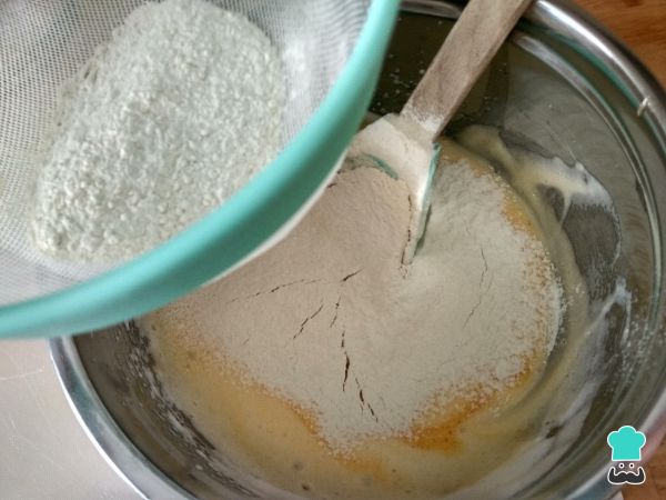 Añadir la harina tamizada y seguir mezclando con movimientos envolventes hasta integrar la harina completamente.
