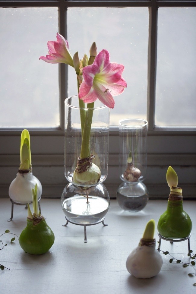 Los bulbos de la planta se colocan en un florero largo con un poco de agua.