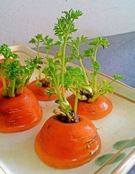 Si pones las partes superiores de las zanahorias en un vaso con agua, rápidamente darán hojas nuevas. Esos brotes son comestibles y puedes añadirlos en ensaladas o comerlos mezclados con miel.