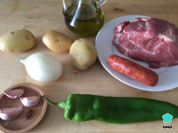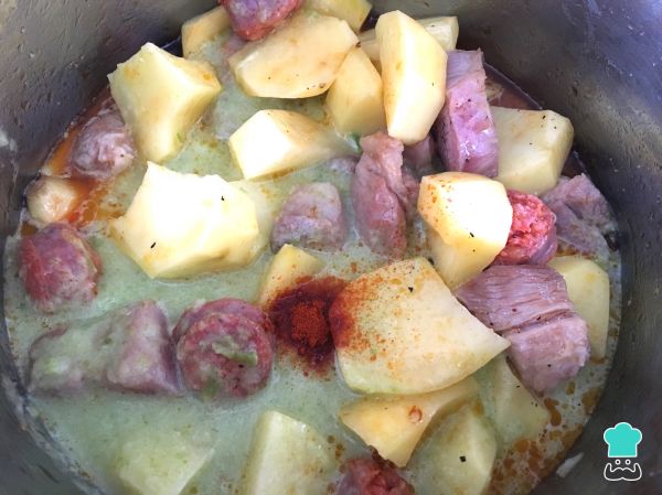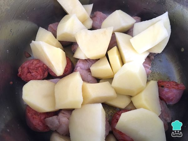 Añade el chorizo cortado en rodajas, las patatas en gajos y la carne de cerdo trozada. Agregamos sal y dejamos que las carnes se doren.
