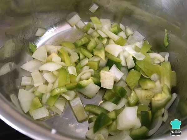 Hacemos un sofrito con la cebolla y el pimiento cortados en cubitos, cocinamos a fuego medio por cinco minutos y luego lo pasamos a un vaso para batidora donde batimos con un poco de agua.