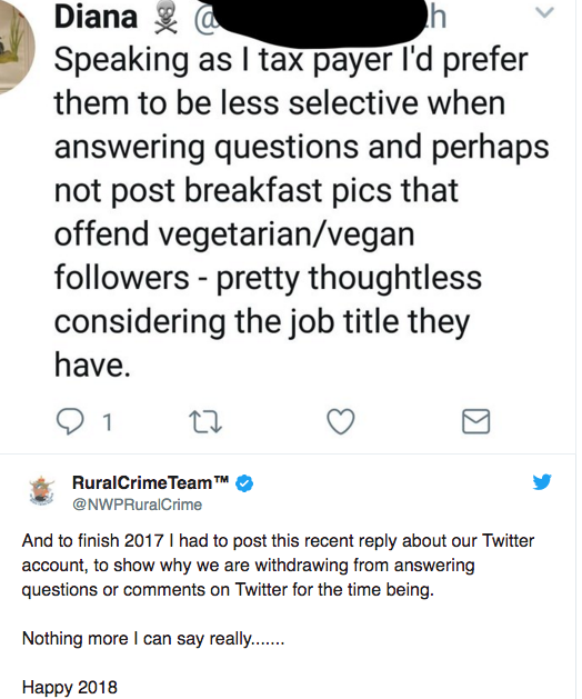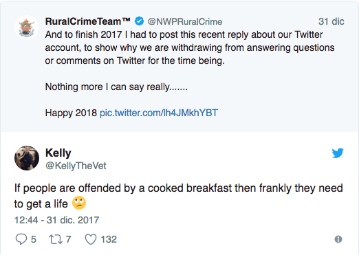 Un buen ejemplo de ello es lo que pasó cuando el Equipo de Crimen Rural de Gales del Norte, publicó una foto de su desayuno, en un tono muy inofensivo.