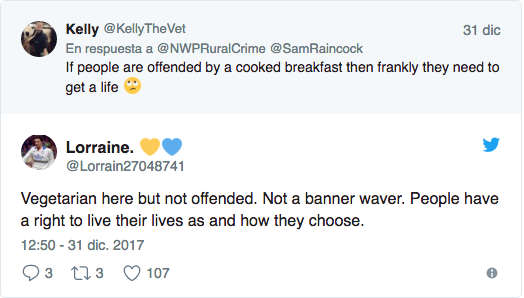 La publicación que tenía como objetivo apoyar la campaña de la Asociación Nacional de Agricultores de Gales sobre este tipo de desayuno, generó la rabia de esta mujer, quien afirmaba que con ello ofendía a sus seguidores vegetarianos y veganos.