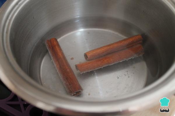 Hierve otros 300 ml de agua y deja en remojo tres ramas de canela para que infusionen el mismo tiempo que el arroz está en remojo.