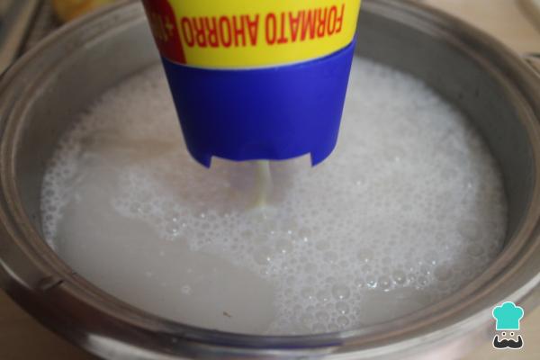 Pasado el tiempo de reposo, saca las ramas de canela del agua y mézclala con el arroz. Agrega 700 ml extra de agua, porque en total deben ser dos litros, y la leche condensada. Mezcla todo con unas varillas manuales.