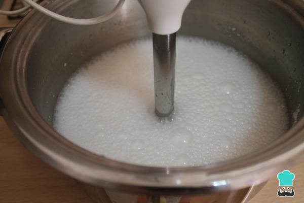 Con una batidora eléctrica tritura la mezcla y los granos de arroz.