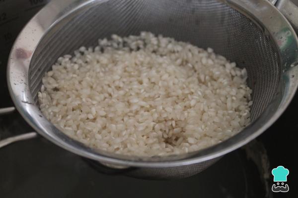 pon el arroz en un colador y enjuaga debajo del grifo hasta que el agua salga blanca y le quitemos almidón al arroz.