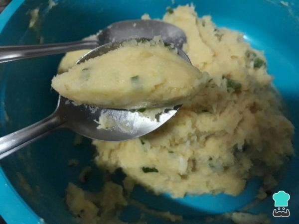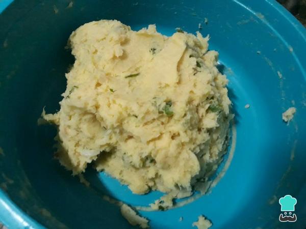 En un bol agrega el puré de papas, el bacalao desmigado, el sofrito y los demás ingredientes de esta receta. Mezcla todo muy bien hasta lograr una masa homogénea.