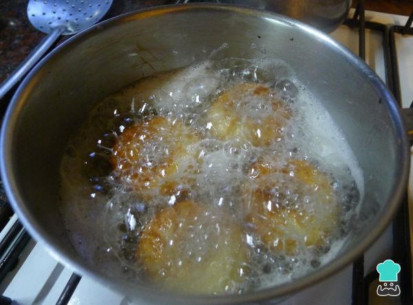 9. Calienta abundante aceite en una olla y fríe las rosquillas a fuego medio.