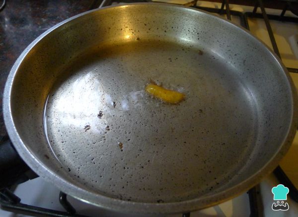 5. Agrega aceite de oliva en una sartén con un trozo de cáscara de limón. Pon fuego alto hasta que la cáscara de dore y luego deja enfriar.