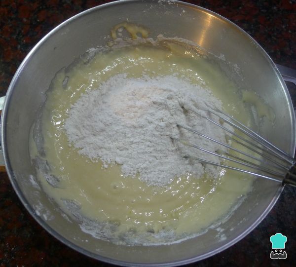 6. Incorpora el aceite y la harina a la mezcla de los huevos.