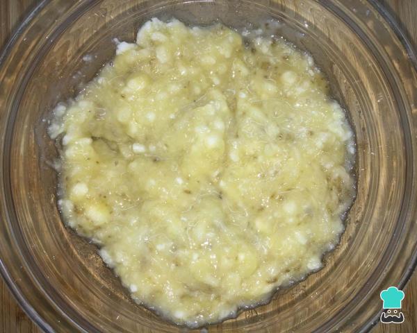 Pea los plátanos, córtalos y machácalos con un tenedor sin triturarlos por completo ya que esto haría que la masa no crezca de forma adecuada en el horno.