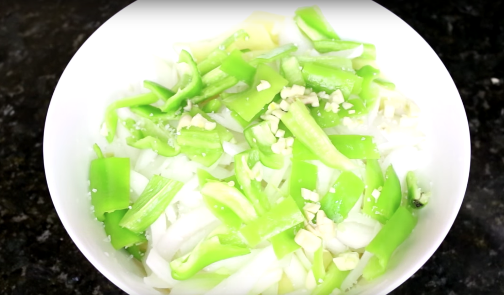 Primero, picar el pimiento y la cebolla, pelar las papas y cortar en rodajas.