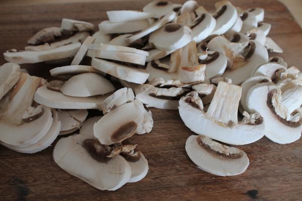 Paso 1: Vamos a preparar los champiñones en vinagre, para ello los suelo pelar, pero si no tenéis costumbre hacerlo, limpiarlos como sueles hacerlo. Tampoco le quitéis el pie del champiñón, como mucho, cortar la punta y cortarlos en láminas finas.