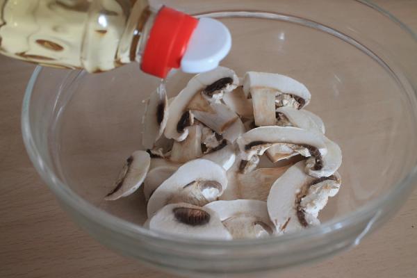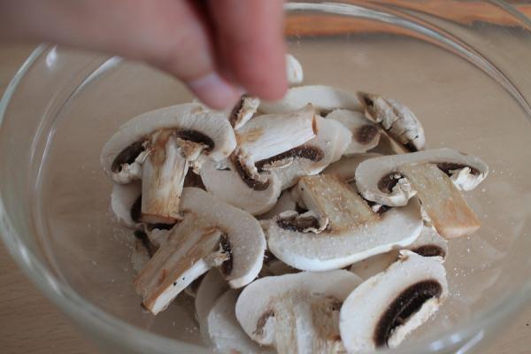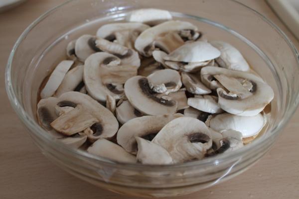 Paso 2: Depositar una capa de láminas de champiñones en un bol o en una fuente rectangular. Esparcir con un poco de sal y con un chorrito de vinagre.