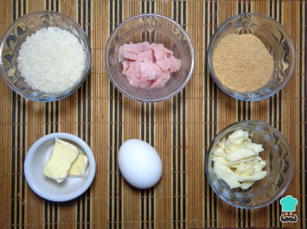 3. Para la masa de las croquetas, coloca el arroz ya cocido en un bol y mezcla con queso, mantequilla, jamón, un poco de huevo batido y salpimienta. Mezcla todo perfectamente.