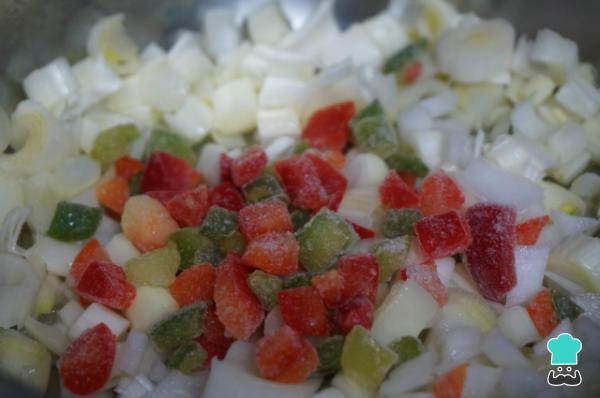 2 . En una sartén caliente un poco de aceite y agrega el puerro junto a la cebolla. Cuando ya estén más blandos añade el calabacín y los trozos de pimientos. Agrega un poco de sal y deja que se cocine.
