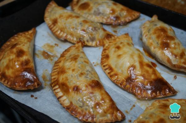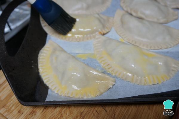 7 . Pon las empanadas en una bandeja para horno. Bate el huevo y píntalas con él usando una brocha. Llévalas al horno a 180ºC durante 30 minutos o hasta que estén doradas.