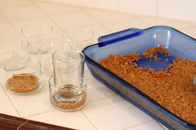 Poner dos cucharadas de base de galletas en cada vasito. Utilizar un vaso pequeño para aplastarla, tal y como se ve en la imagen.