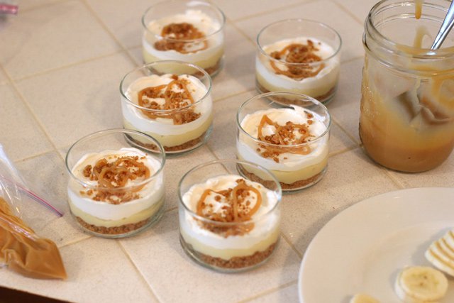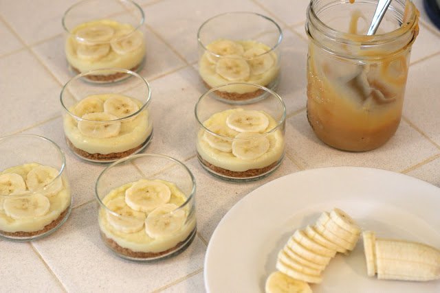 Después, añadir una capa de crema pastelera y tres rodajas de plátano.