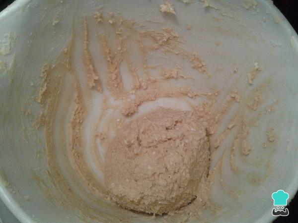 4 . En un recipiente aparte mezcla la harina, la avena y la levadura. Luego agrega esta mezcla a la pasta de huevo con mantequilla.