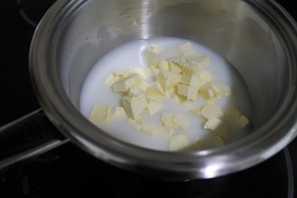 1. En una olla pon la leche, el agua, la sal, el azúcar y la mantequilla cortada en trocitos. Lleva al fuego hasta la ebullición para empezar a elaborar la pasta.