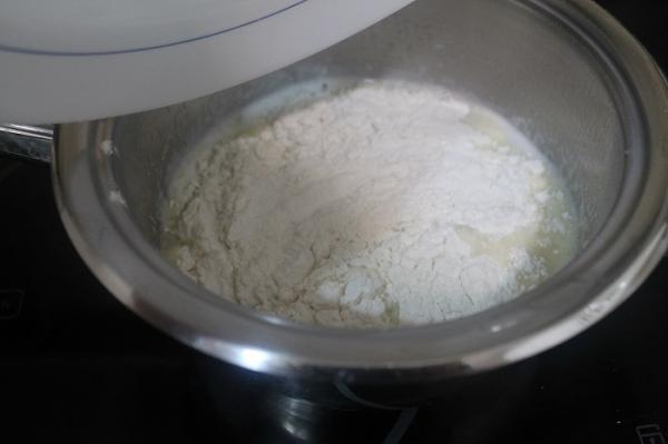 2. Retira la preparación del fuego y añade de golpe la harina. Remueve con una cuchara de madera y vuelve a poner al fuego.