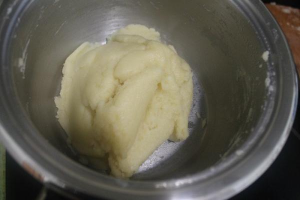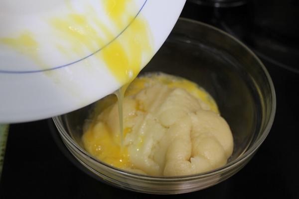 4. Bate un huevo y añade a la pasta. Incorpora bien y añade el resto de huevos uno a uno de la misma manera, hasta conseguir una masa lisa y brillante.