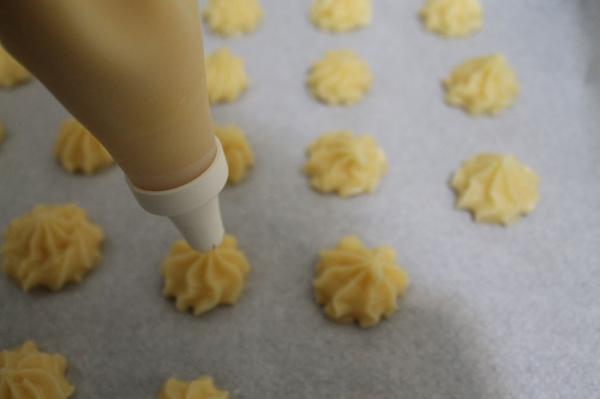 5. Precalienta el horno a 190ºC. Pon la masa de profiteroles en una manga pastelera con una boquilla en forma de estrella. Forra una bandeja con papel de horno. Con una manga pastelera recta, deposita pequeños montoncitos separados entre sí, ya que en el horno crecerán.