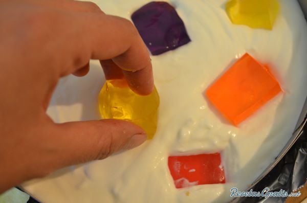 10. Introduce los cubos de gelatina de sabores. Golpea el molde suavemente contra la mesa para eliminar el aire.