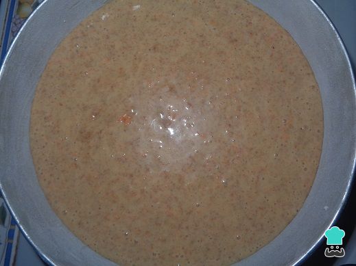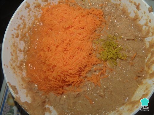 4. Añadir la zanahoria rallada junto con la ralladura de naranja y el judo de las naranjas. Batir por 5 minutos más.