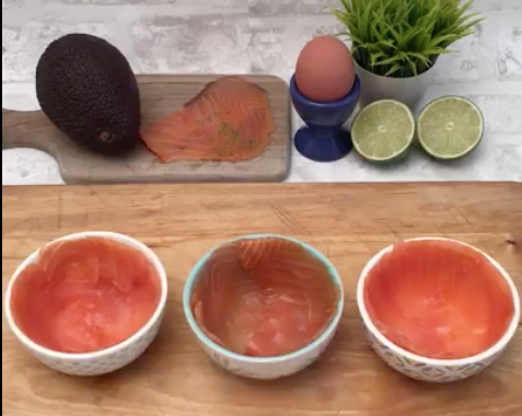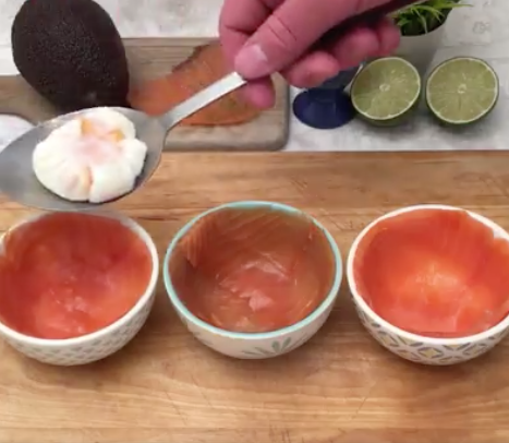 Primero, poner las láminas de salmón ahumado en un bol, cubriendo toda la superficie (2 láminas por bol)