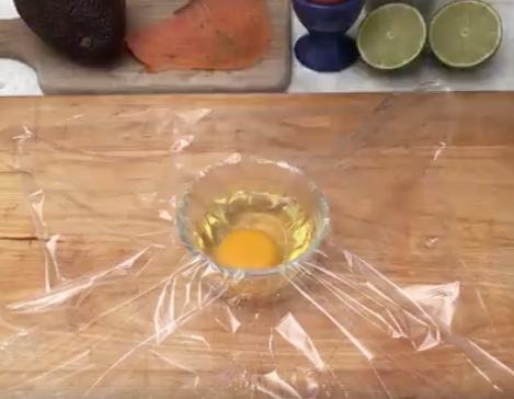 Después, poner un trozo de film transparente en otro bol y pinta la zona del cuenco con un poco de aceite de oliva, ayudándote con una brocha de cocina. Después, poner un huevo dentro y hacer un nudo al film, como si fuese una bolsita.