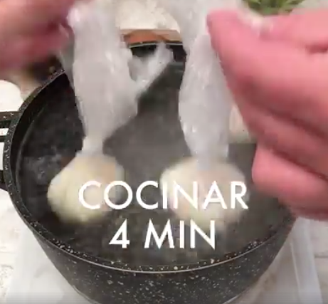 Ahora se ponen a cocer los huevos dentro de sus bolsas, durante 4 minutos.