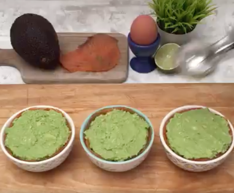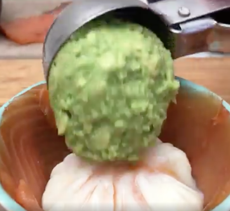 Con una cuchara de helado, tomar la palta y poner sobre los huevos y el salmón, extendiendo uniformemente hasta el ras.
