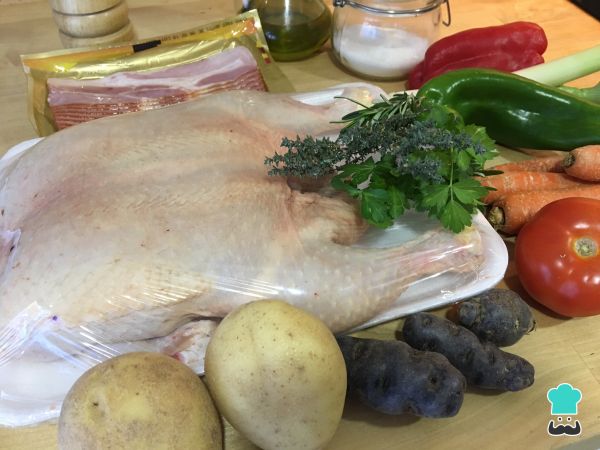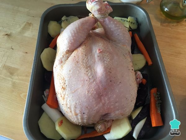 Rellenar el pollo con el sofrito de verduras, poner un ramillete de tomillo y romero dentro del pollo y cerrar la cavidad con el hilo de cocina o cosiéndolo con una aguja especial de cocina.