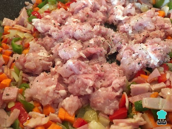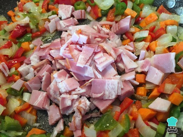 2. Primero haremos el rellenos del pollo. Hacer un sofrito con la cebolleta, los pimientos y la zanahoria, todo troceado en cuadritos. Dejar que se doren las verduras por 8 minutos y agregar el bacon en trocitos. Salpimentar y dejar que se cocine por 5 minutos más.