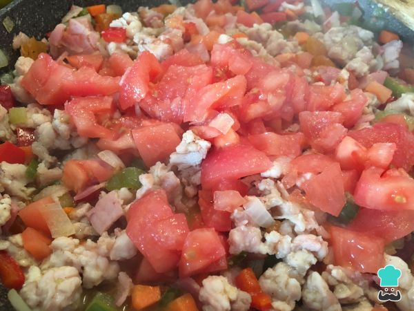 4. Agrega un par de tomates peados y picados al sofrito, y deja que se cocinen por 5 minutos. Retira del fuego y añade los orejones picados.