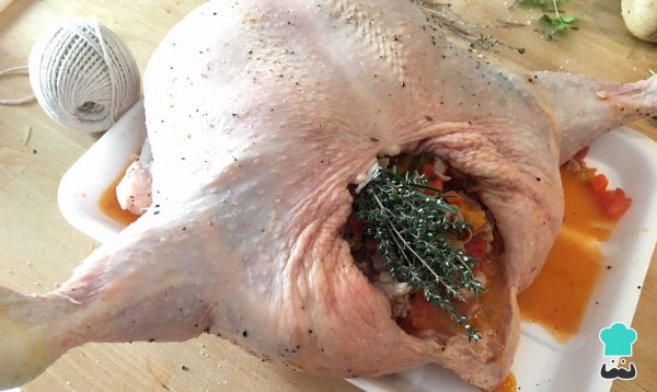 5. Salpimentar bien el pollo por fuera y por dentro. Cerrar la parte de la cabeza del pollo que tiene un hueco por donde se puede salir el relleno. Para ello puedes usar un hilo especial de cocina.