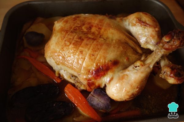 Meter al horno a 180ºC por 1 hora y 50 minutos aproximadamente, todo dependerá del peso del pollo). Cada 2o o 25 minutos tiene que rociar el pollo con el jugo que hay en la base de la bandeja para que no se reseque. En la mitad de la cocción es conveniente que lo des vuelta para que se cocine bien por todas partes.