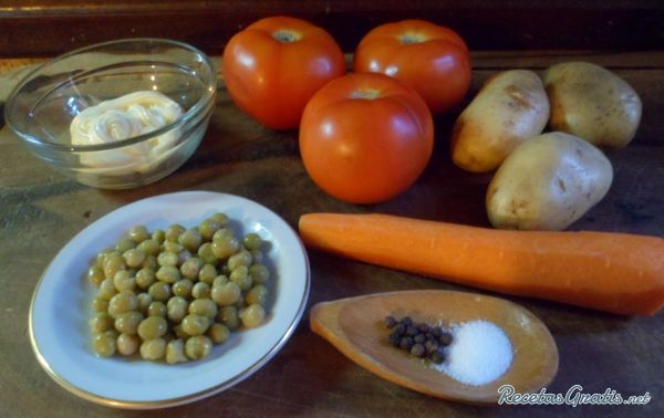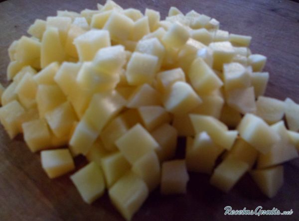 Paso 4:Por otro lado, cortamos las papas en cubos. Para los tomates rellenos, es necesario cortar, las papas y las zanahorias más pequeñas que en una ensalada rusa tradicional.