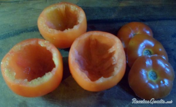 Paso 6: Mientras se van cocinando los ingredientes para los tomates rellenos, los vamos ahuecando de esta manera: cortamos la tapa superior de los mismos y les quitamos toda la pulpa con una cuchara, teniendo cuidado que no se rompan.