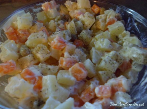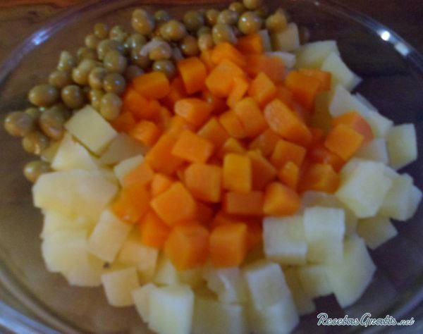 Paso 7: Tomamos un bowl y colocamos las papas y la zanahoria cocidas junto con las arvejas.