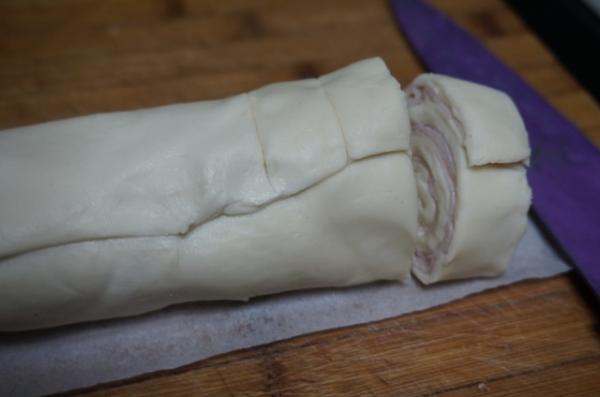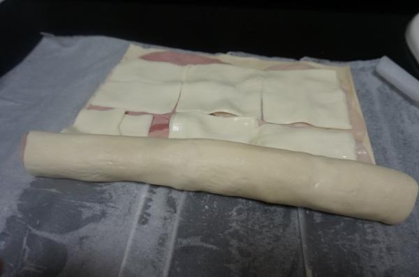 4. Enrolla la masa de hojaldre relleno con jamón y queso con cuidado, para que no se salgan los ingredientes. Hazlo hasta formar un rollo.