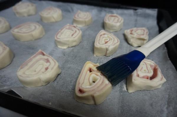 7. Bate el huevo y pinta los rollitos con una brocha de cocina.