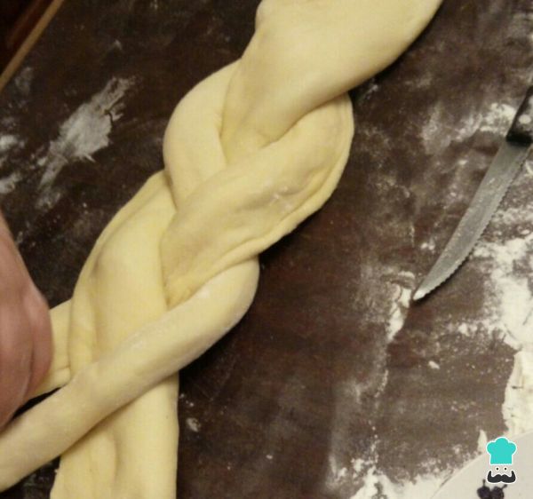 3. Deja leudar hasta que la masa doble su volumen. Quita el aire de la masa y corta 3 piezas del mismo tamaño. Amasarlas por separado para formar bastones y agregar tiras de dulce de membrillo en su interior. Trenzar la tiras.